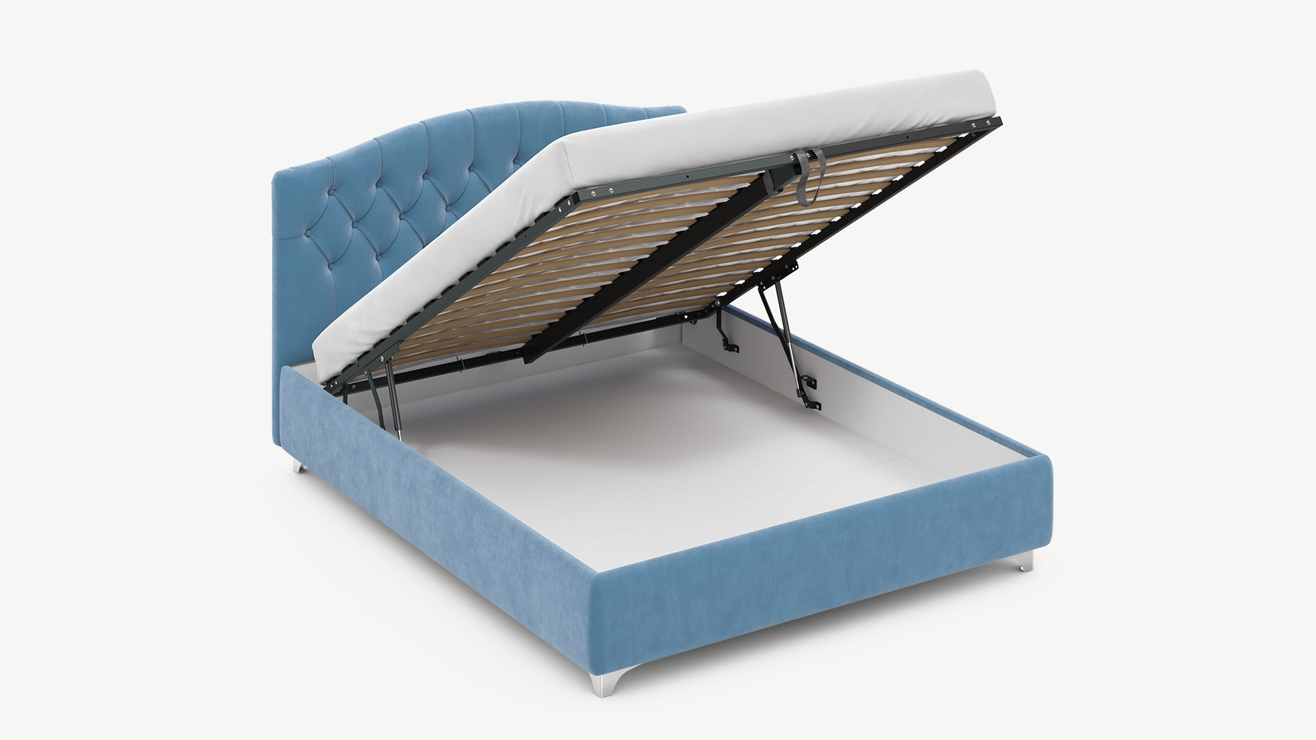 - Скрытая под основанием вместительная емкость без внутренних перегородок позволяет использовать всю площадь подкроватного пространства для хранения вещей.