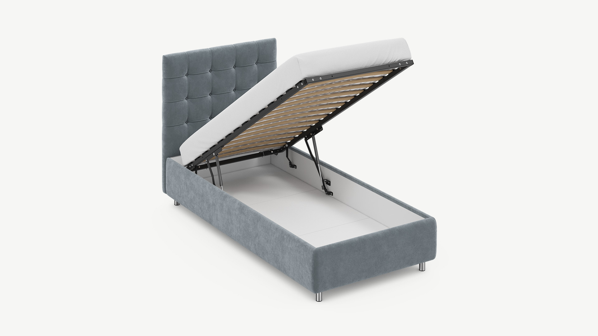 • Скрытая под основанием вместительная емкость без внутренних перегородок позволяет использовать всю площадь подкроватного пространства для хранения вещей.