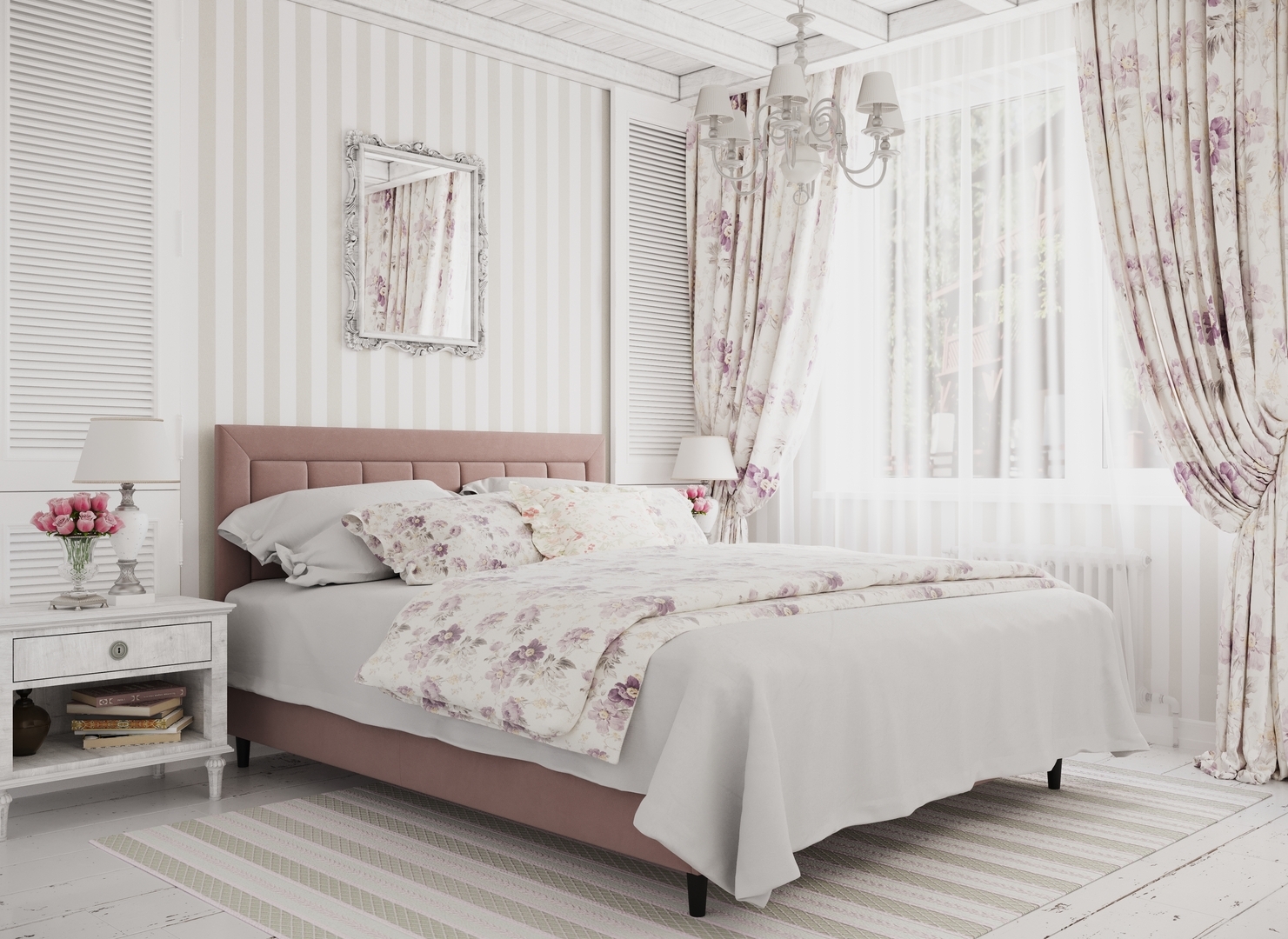 Стежка помещена в центр изголовья и обрамлена, словно картина. Объемные царги завершают цельную фигуру кровати и становятся гармоничным дополнением ее образа.