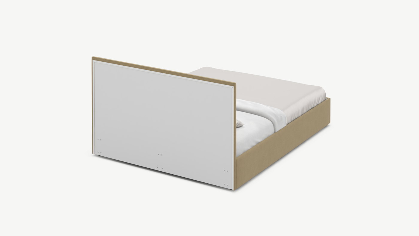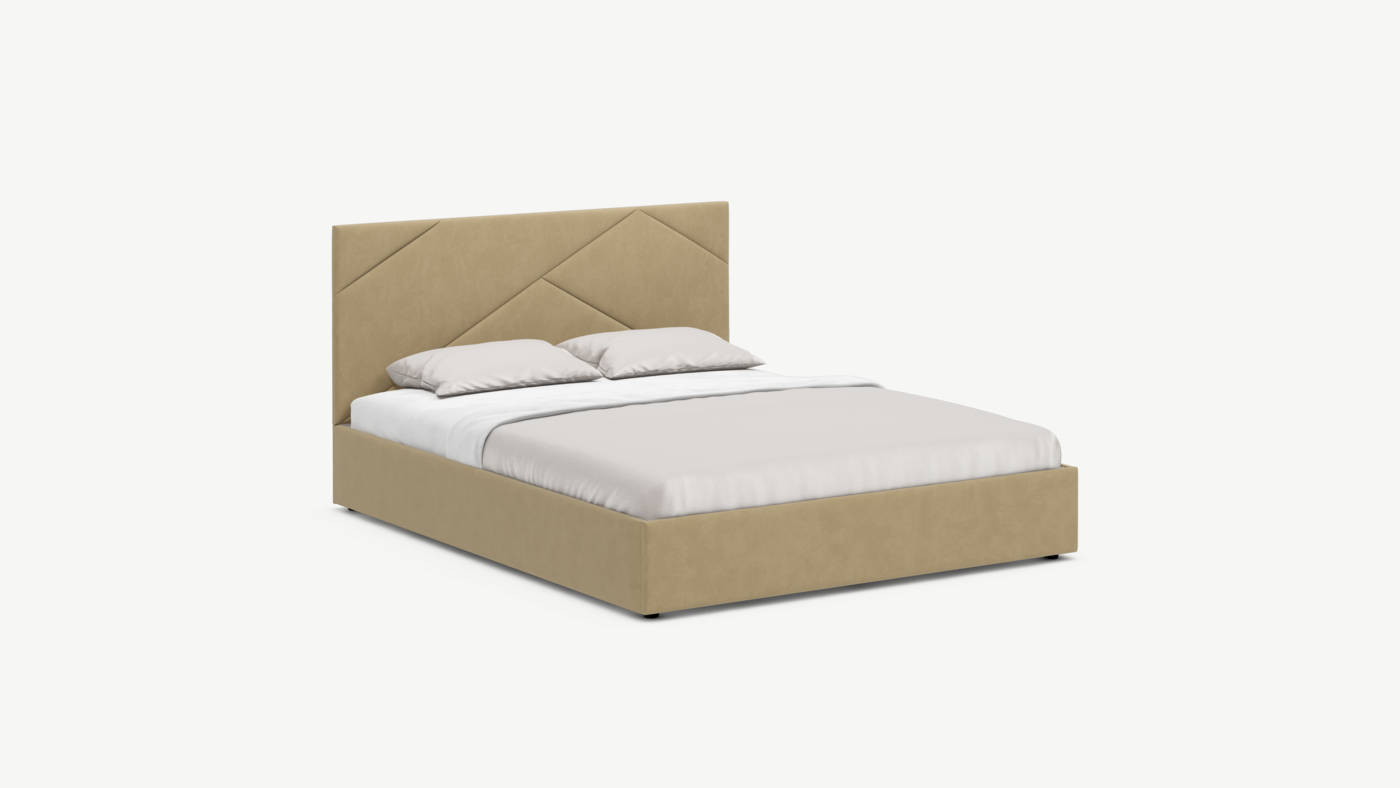 MOON FAMILY 1257 привлекает внимание оригинальным исполнением: широкие полосы ткани эффектно пересекают периметр изголовья, создавая на нем графический орнамент. Лаконичные формы объемных царг создают единый гармоничный образ и фокусируют внимание на центральном текстурном элементе кровати.