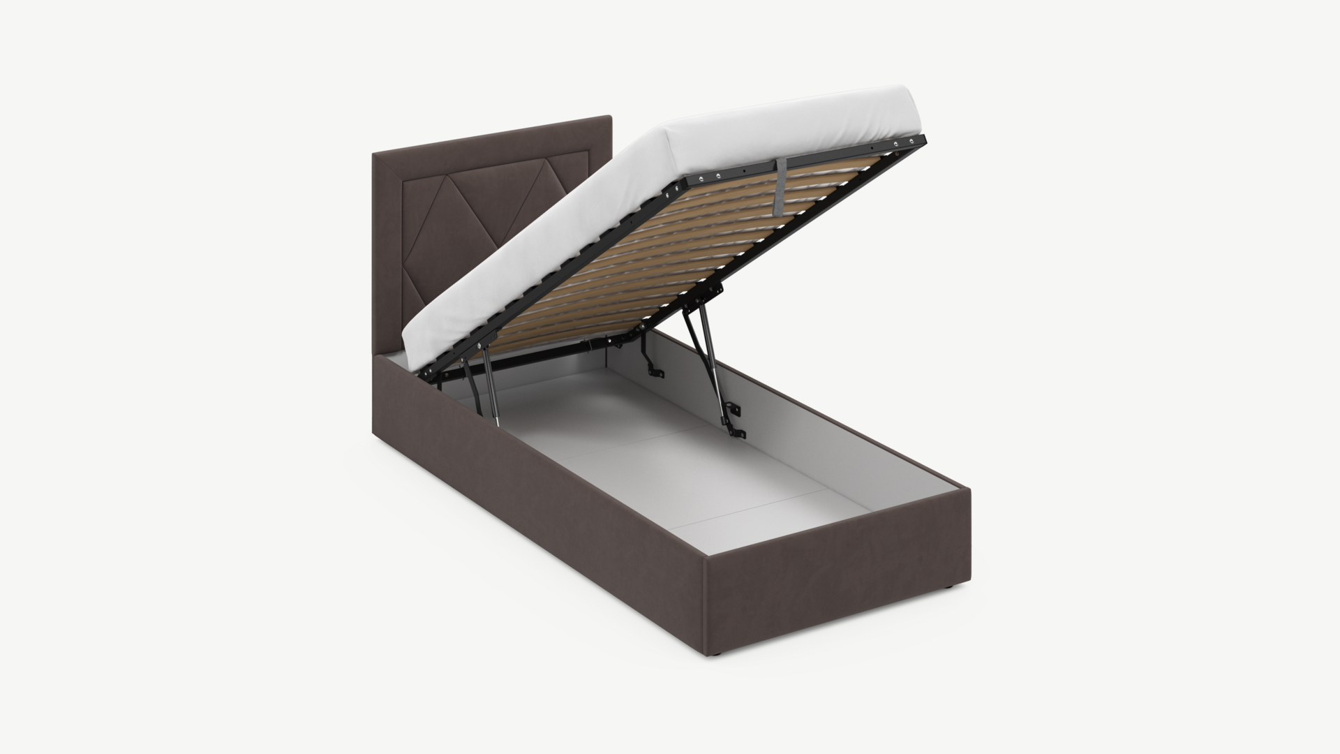 • Скрытая под основанием вместительная емкость без внутренних перегородок позволяет использовать всю площадь подкроватного пространства для хранения вещей.
