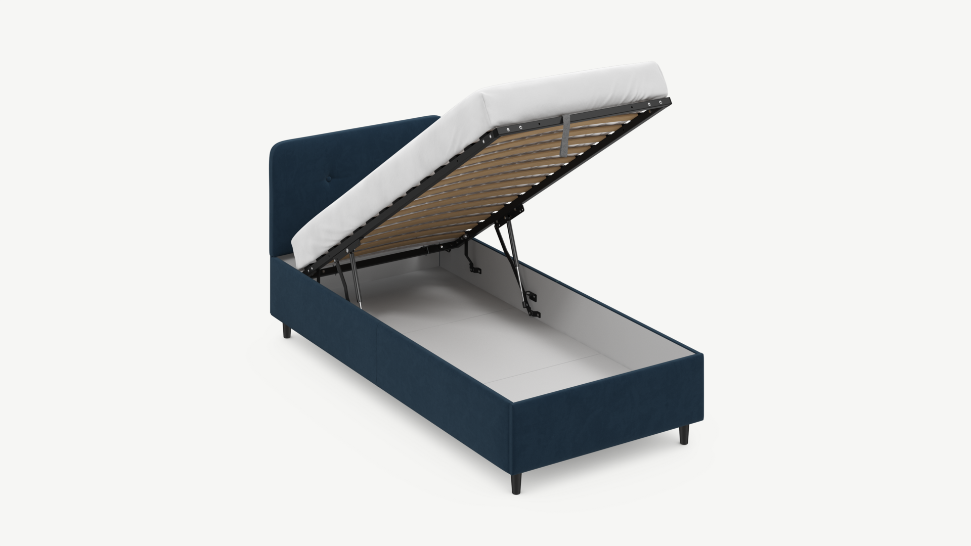 - Скрытая под основанием вместительная емкость без внутренних перегородок позволяет использовать всю площадь подкроватного пространства для хранения вещей.