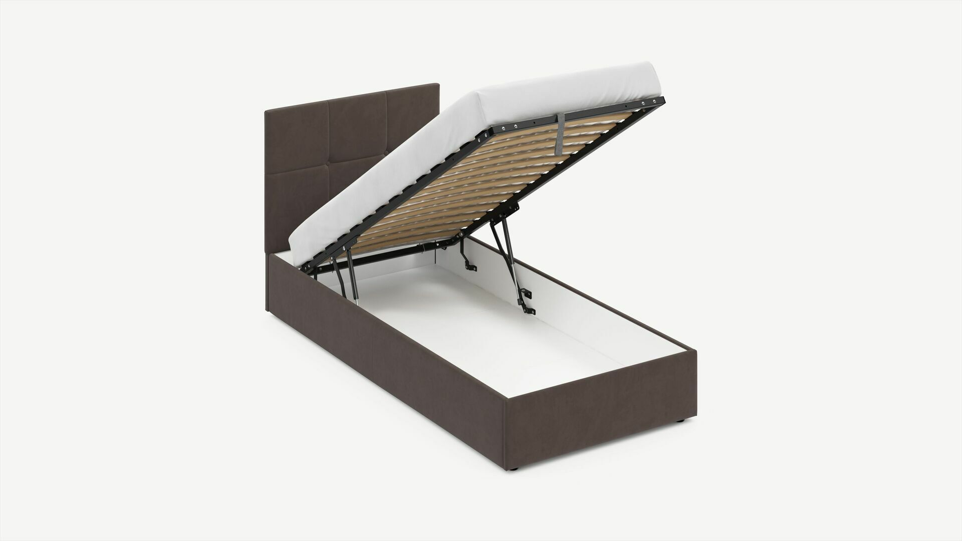 • Скрытая под основанием вместительная емкость без внутренних перегородок позволяет использовать всю площадь подкроватного пространства для хранения вещей.