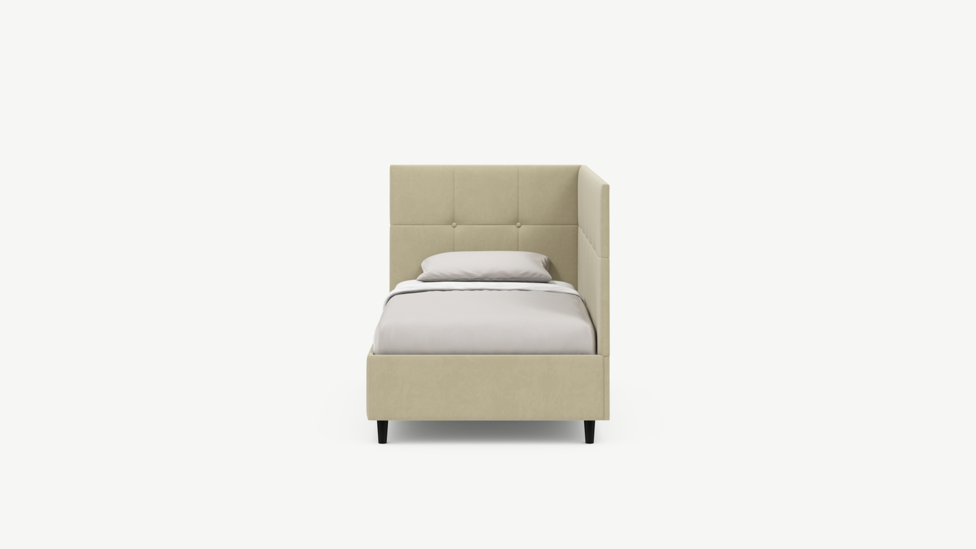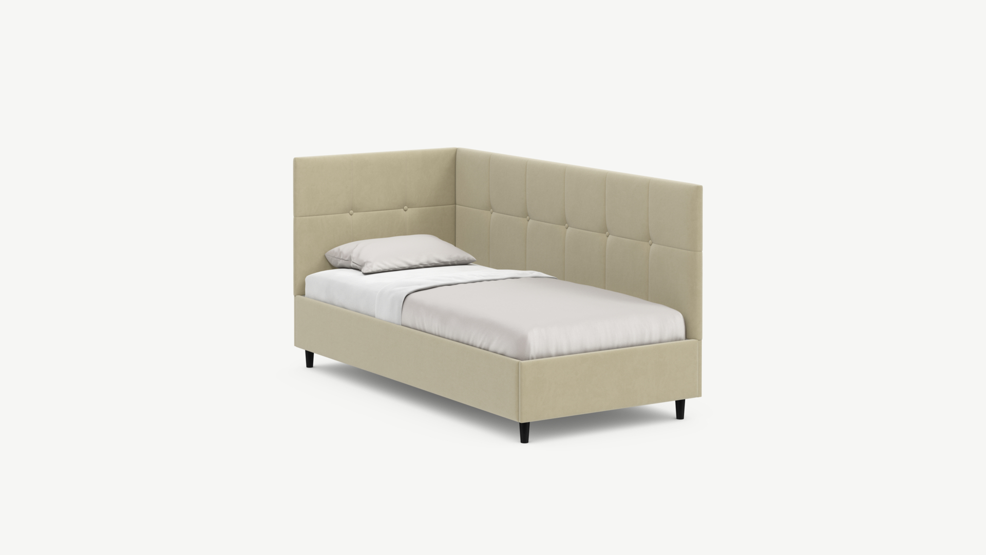 Угловая односпальная кровать MOON FAMILY 1261 с мягкой спинкой и изголовьем создаст в Вашей спальне ощущение уюта. Крупная квадратная стежка привносит в интерьер графических акцентов, а вставка из пуговиц наполняет пространство ощущением домашнего тепла.