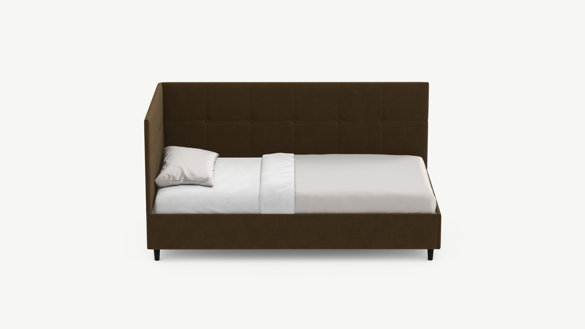 Угловая односпальная кровать MOON FAMILY 1261 с мягкой спинкой и изголовьем создаст в Вашей спальне ощущение уюта. Крупная квадратная стежка привносит в интерьер графических акцентов, а вставка из пуговиц наполняет пространство ощущением домашнего тепла.