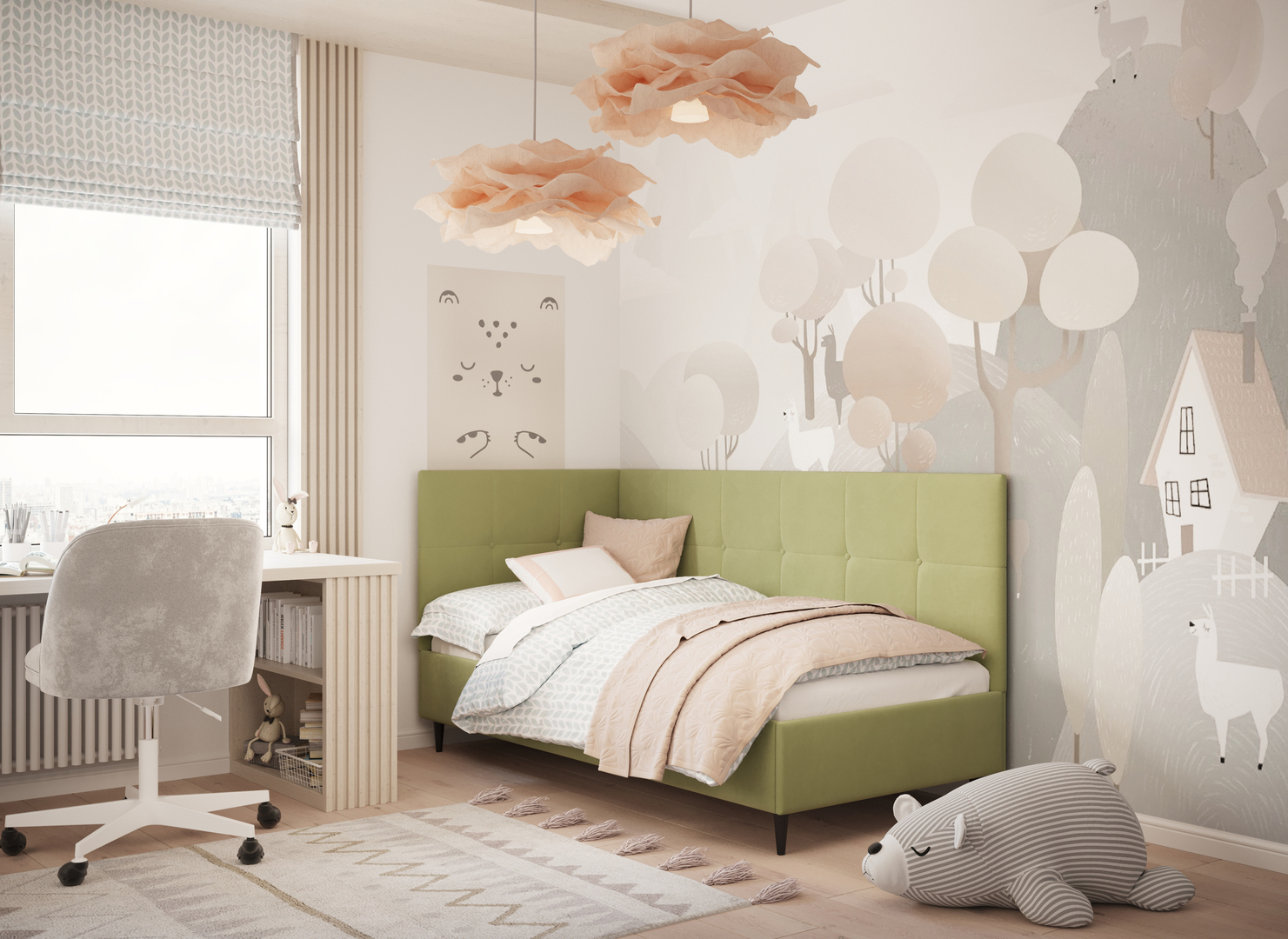 MOON FAMILY 1261 объединяет функциональность и стиль, создавая гармоничное пространство для отдыха и творчества. Кровать доступна в левостороннем и правостороннем исполнении, что позволяет легко адаптировать ее под любые интерьерные особенности.