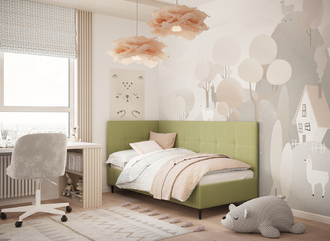 Угловая односпальная кровать MOON FAMILY 1261 с мягкой спинкой и изголовьем создаст в Вашей спальне ощущение уюта. Крупная квадратная стежка привносит в интерьер графических акцентов, а вставка из пуговиц наполняет пространство ощущением домашнего тепла.