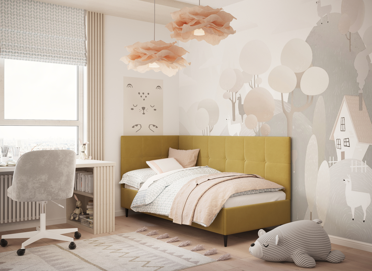 MOON FAMILY 1261 объединяет функциональность и стиль, создавая гармоничное пространство для отдыха и творчества. Кровать доступна в левостороннем и правостороннем исполнении, что позволяет легко адаптировать ее под любые интерьерные особенности.