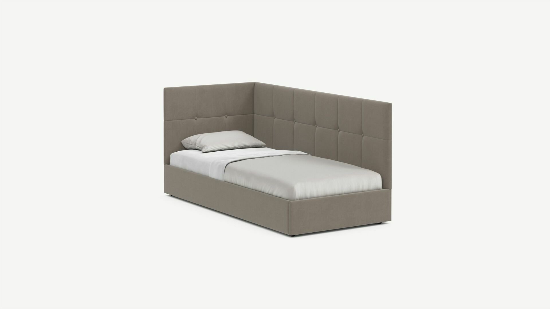 Угловая односпальная кровать MOON FAMILY 1261 с мягкой спинкой и изголовьем создаст в Вашей спальне ощущение уюта. Крупная квадратная стежка привносит в интерьер графических акцентов, а вставка из пуговиц наполняет пространство ощущением домашнего тепла.