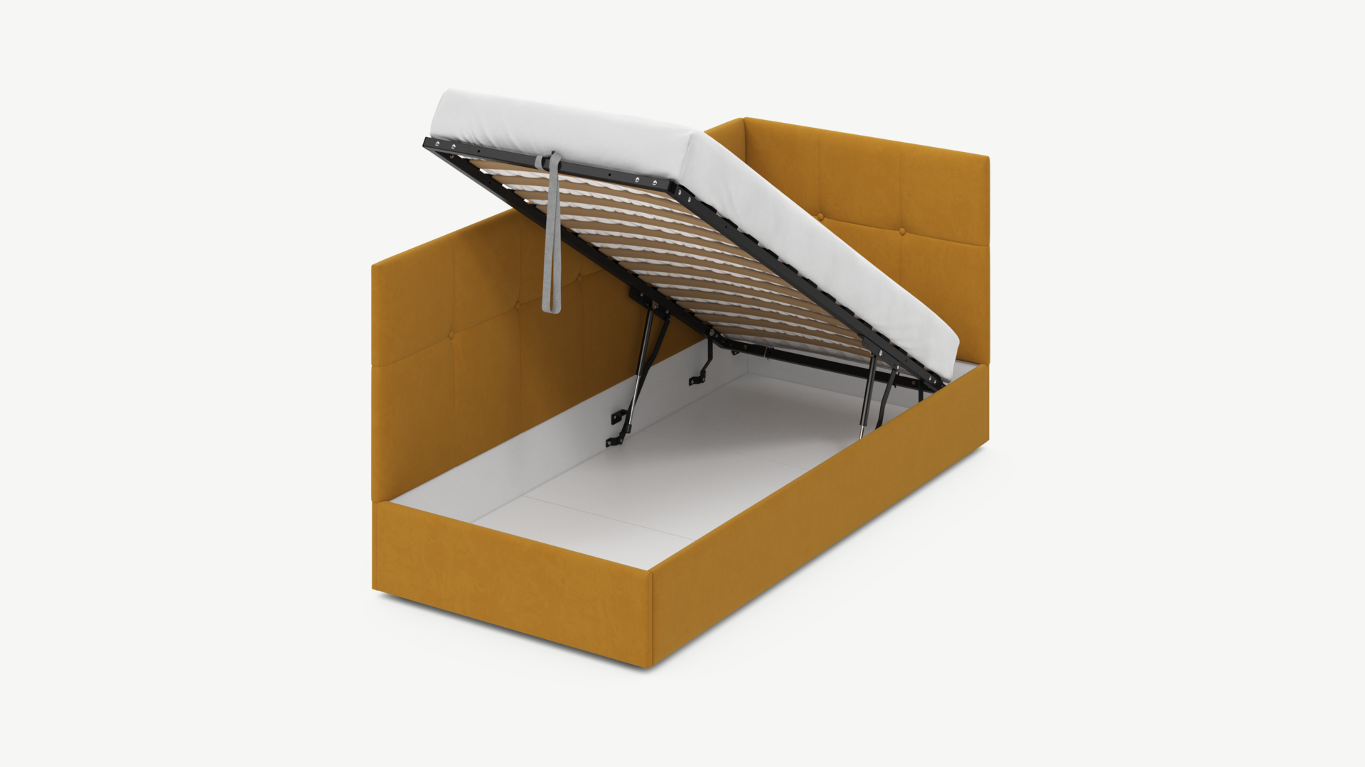 Угловая односпальная кровать MOON FAMILY 1261 с мягкой спинкой и изголовьем создаст в Вашей спальне ощущение уюта. Крупная квадратная стежка привносит в интерьер графических акцентов, а вставка из пуговиц наполняет пространство ощущением домашнего тепла.