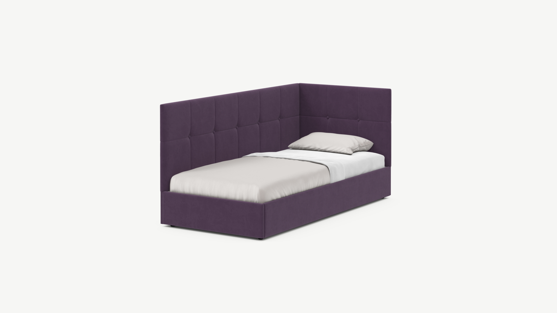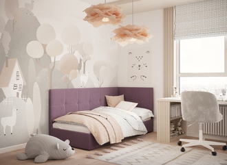 Угловая односпальная кровать MOON FAMILY 1261 с мягкой спинкой и изголовьем создаст в Вашей спальне ощущение уюта. Крупная квадратная стежка привносит в интерьер графических акцентов, а вставка из пуговиц наполняет пространство ощущением домашнего тепла.