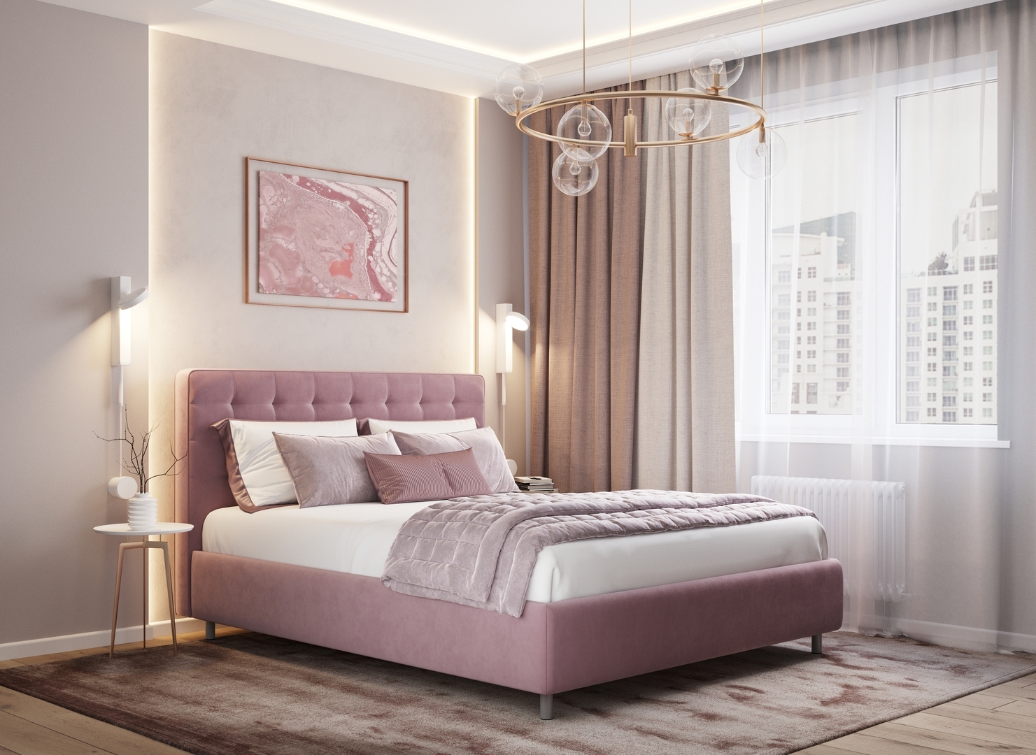 Оформите образ кровати, выбирая обивочный материал, который подчеркнет звучание Вашей спальни и отразит Ваш вкус. Обратите внимание на однотонный гладкий велюр, который усиливает объемную фактуру стежки.
