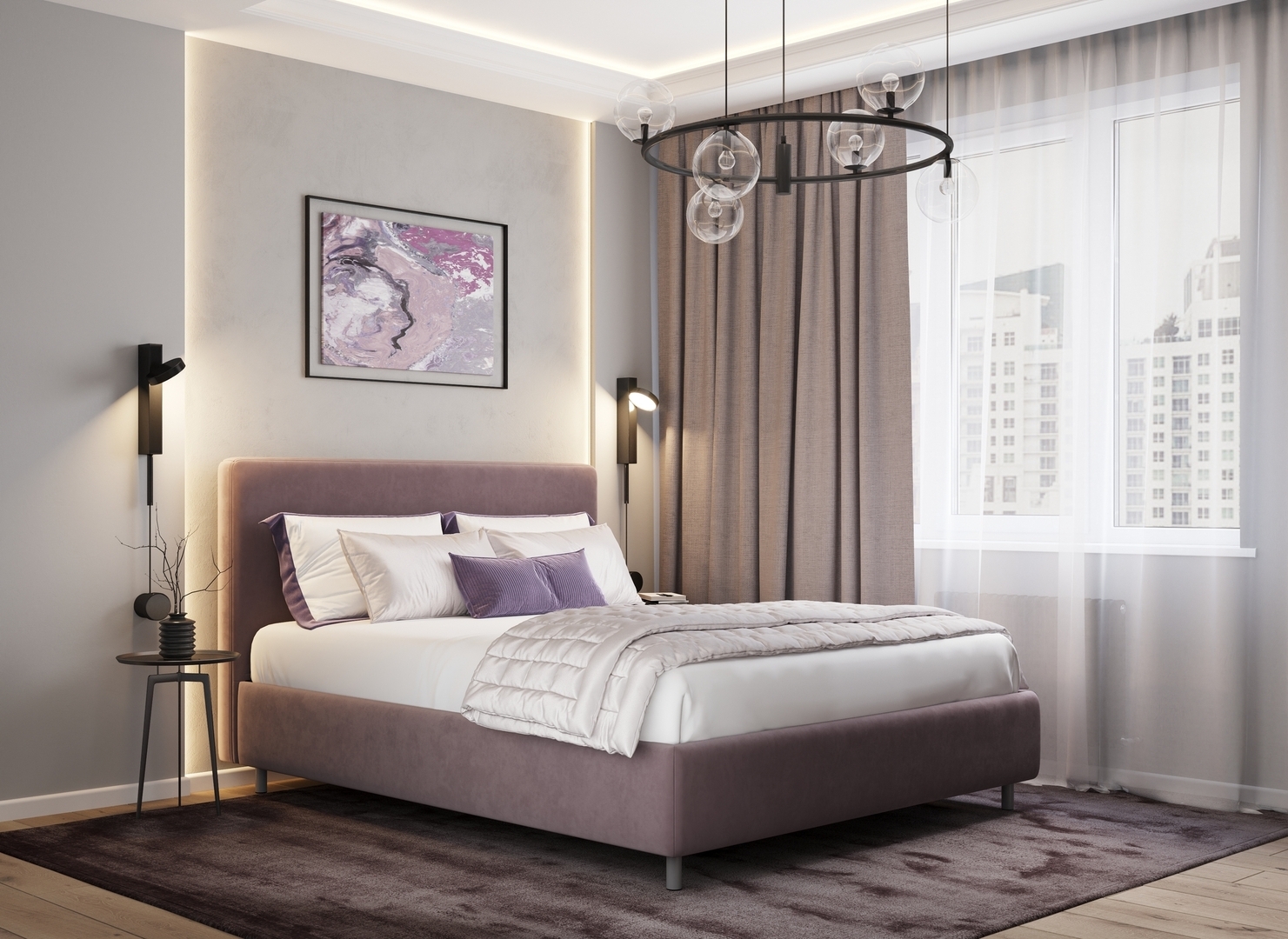 Творческий подход к выбору обивочного материала меняет образ дизайна. Велюр за счет своей бархатистой фактуры привносит в пространство шика и утонченности. Шенилл дополняет оформление спальни природными текстурами, создавая атмосферу тепла и уюта.