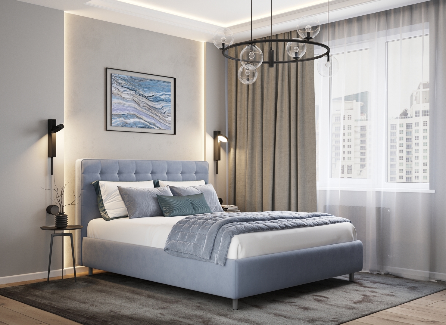 Оформите образ кровати, выбирая обивочный материал, который подчеркнет звучание Вашей спальни и отразит Ваш вкус. Обратите внимание на однотонный гладкий велюр, который усиливает объемную фактуру стежки.