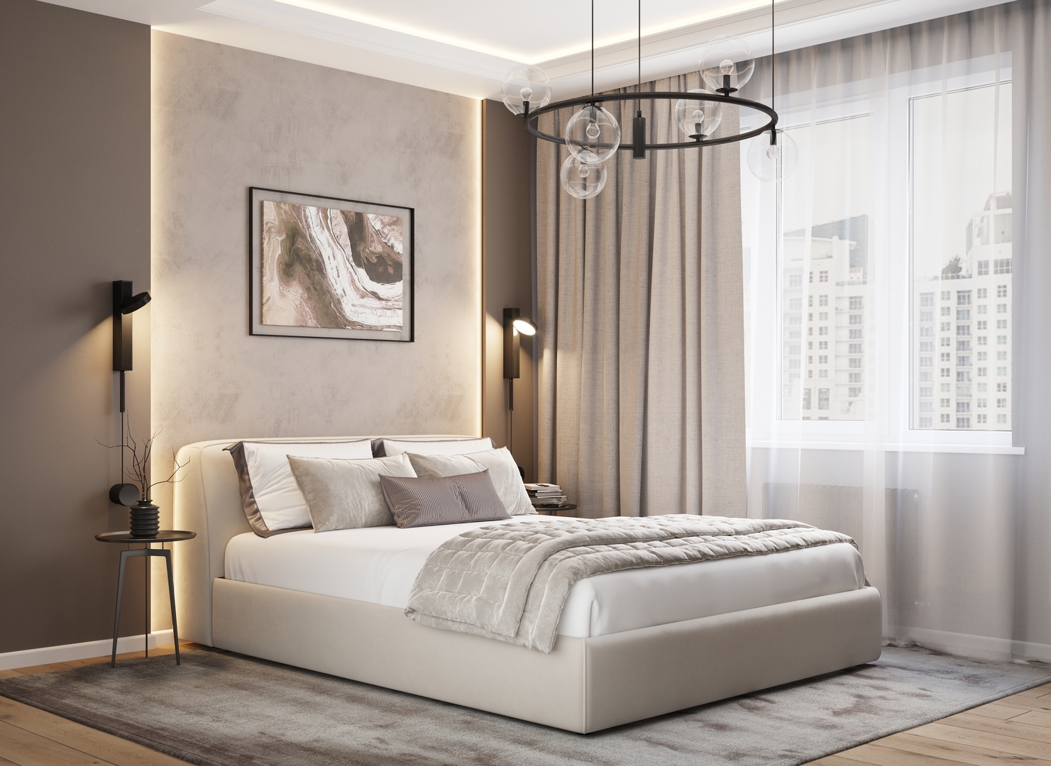 Творчески завершить образ спальни помогут дополнительные аксессуары: декоративные подушки, тумбы, а также покрывала-саше.